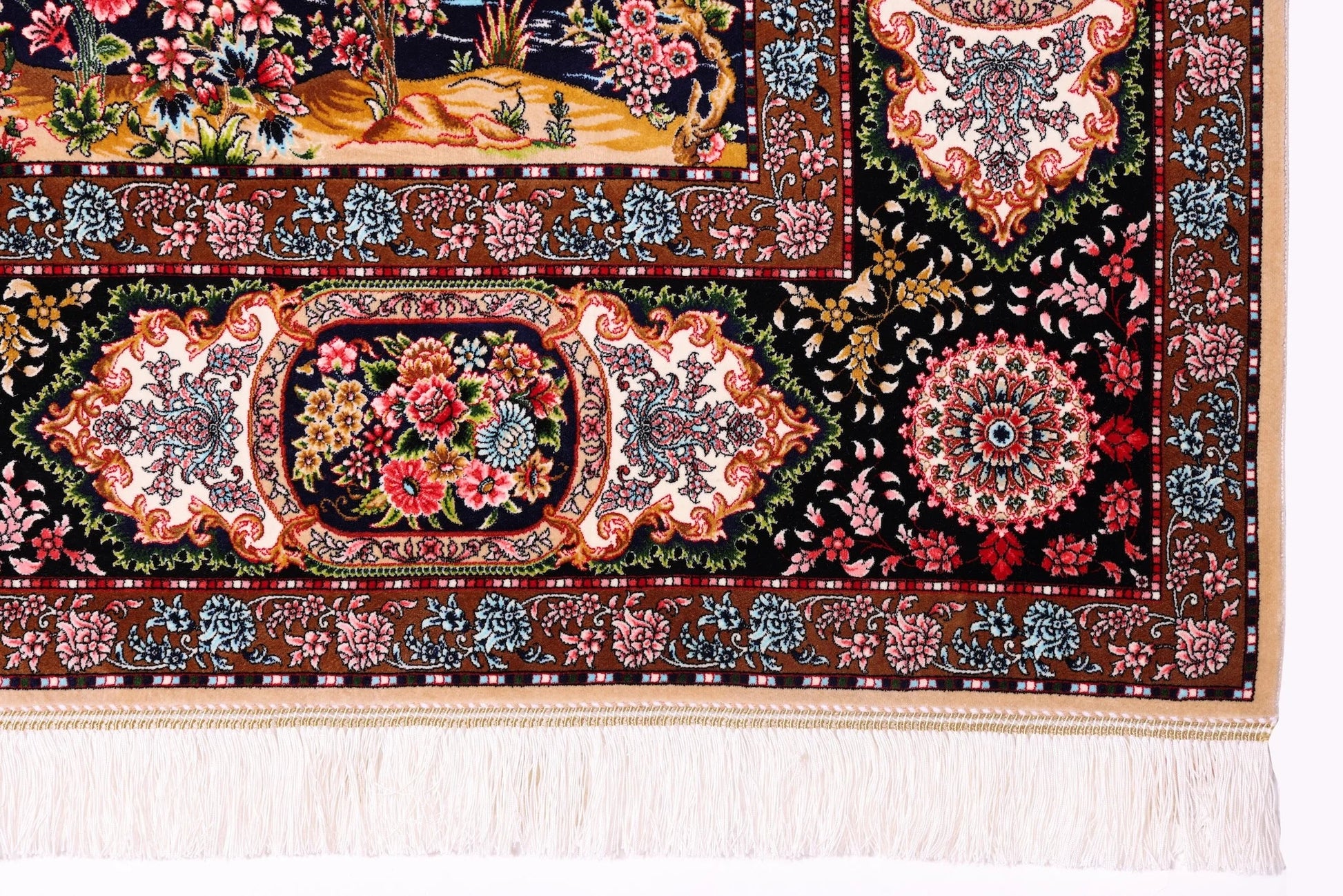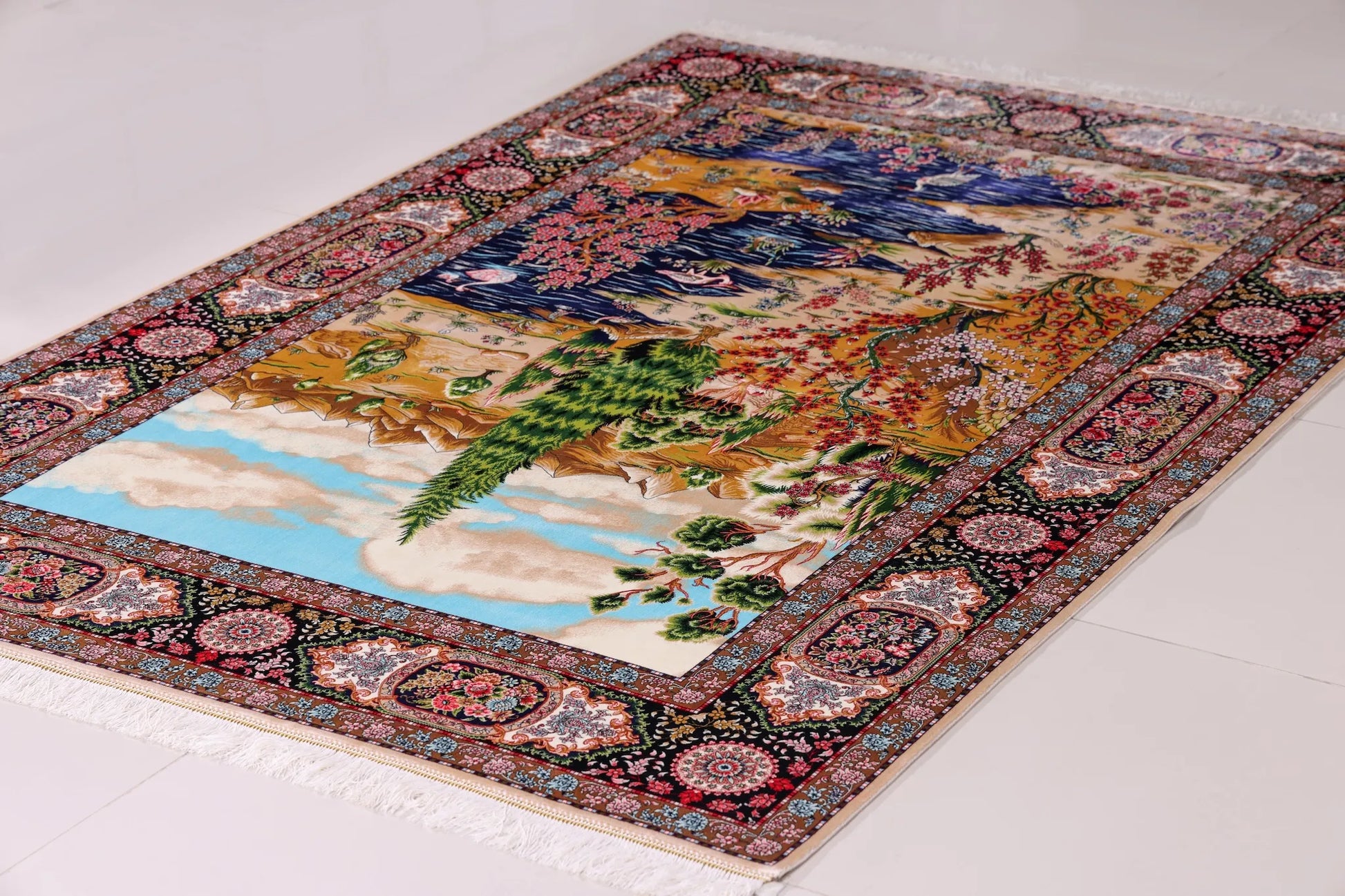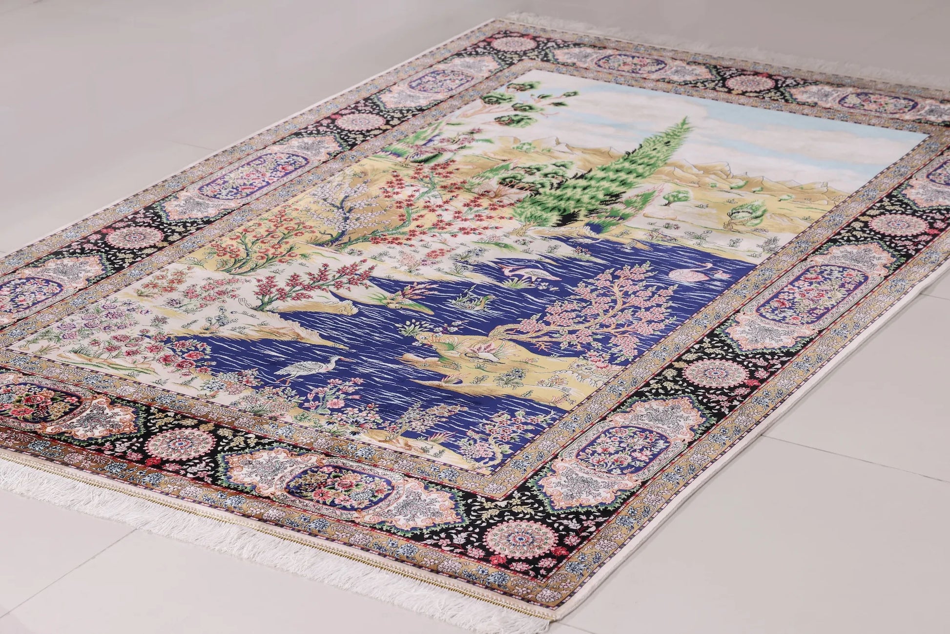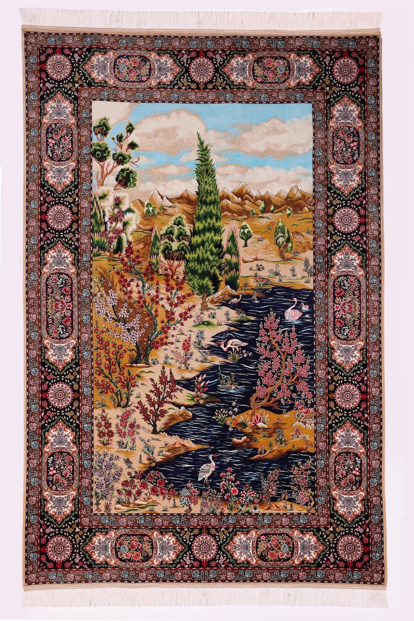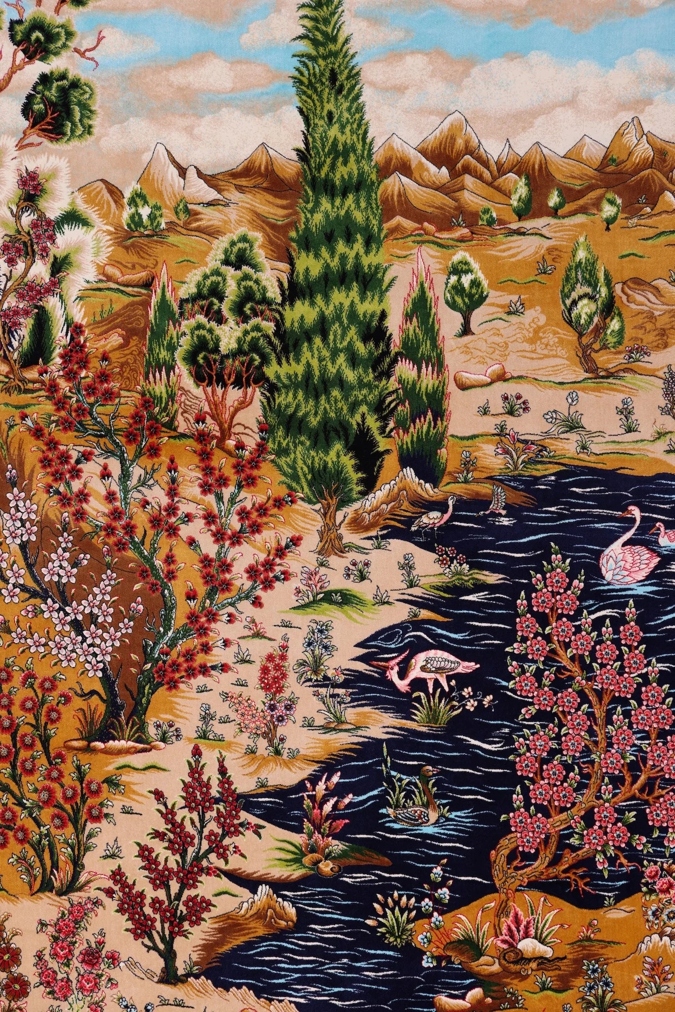 This finely detailed 1700-reed rug captures a lush Persian garden scene—flowing water, blossoming trees, and elegant birds—set against distant mountains. Machine-woven with silk-alternative fibres, it offers precise motifs and a subtle sheen that shifts with the light. Inspired by the Chahar Bagh tradition, it honours a legacy of harmony between nature and artistry.